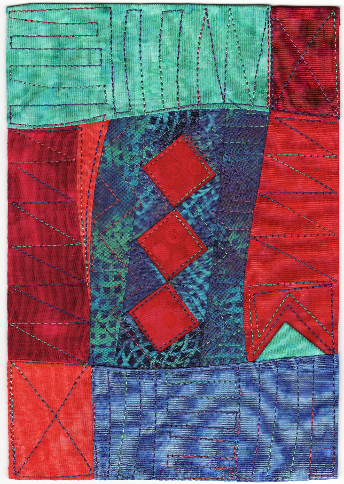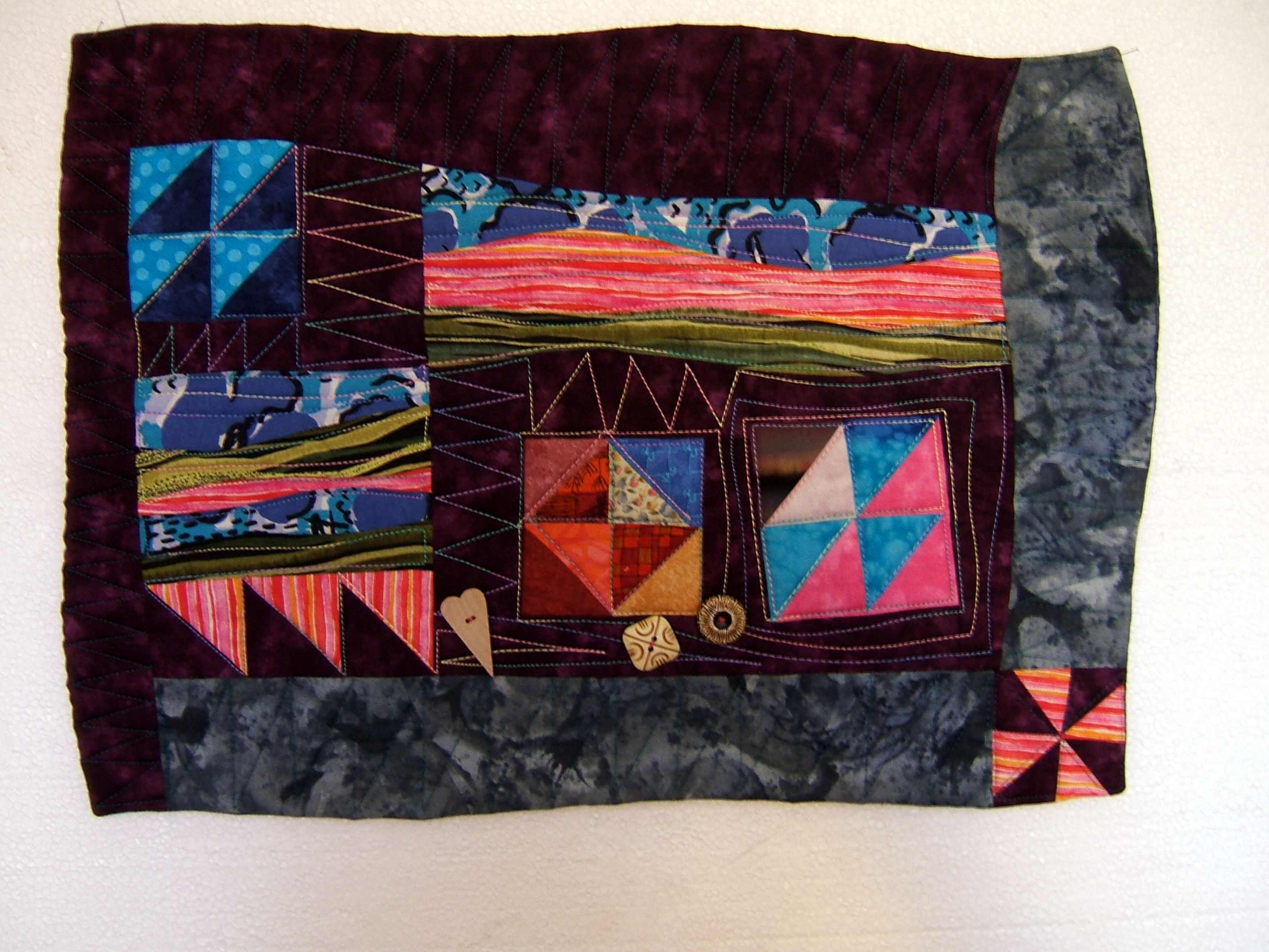 'Pinboard Quilt' a small quilt using similar techniques which is finished with wadding and quilted by machine.