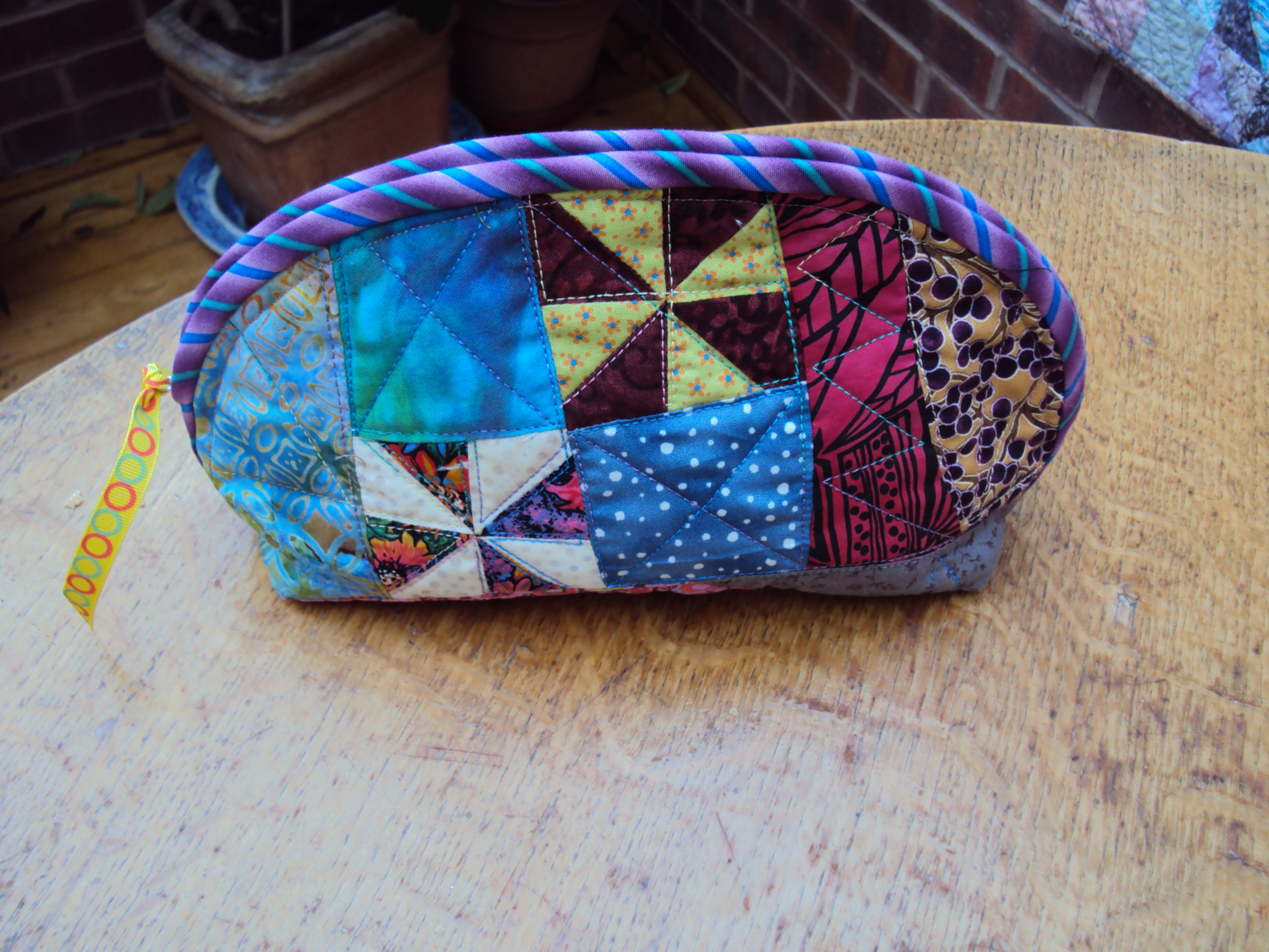 bring a piece of wadding and lining for the inside 16” x 12” and a 12” zip plus a fat quarter for the binding.